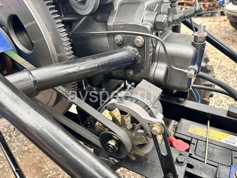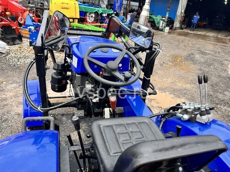Одноцилиндровый двигатель на дизельном топливе обеспечивает достойную мощность в 24 л.с. Трансмиссия, подобная полноразмерным тракторам, в совокупности с усиленной задней осью делает его еще более надежным и удобным для выполнения различных сельскохозяйственных работ. Привод трактора ременной.